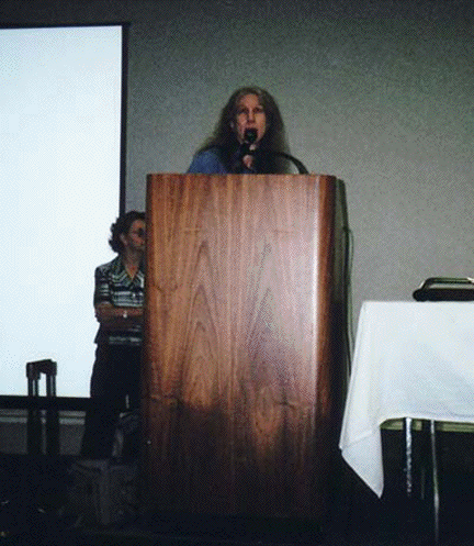 Linda Iroff announcing the next guest speaker... Brenda Johnson, who awaits her turn.